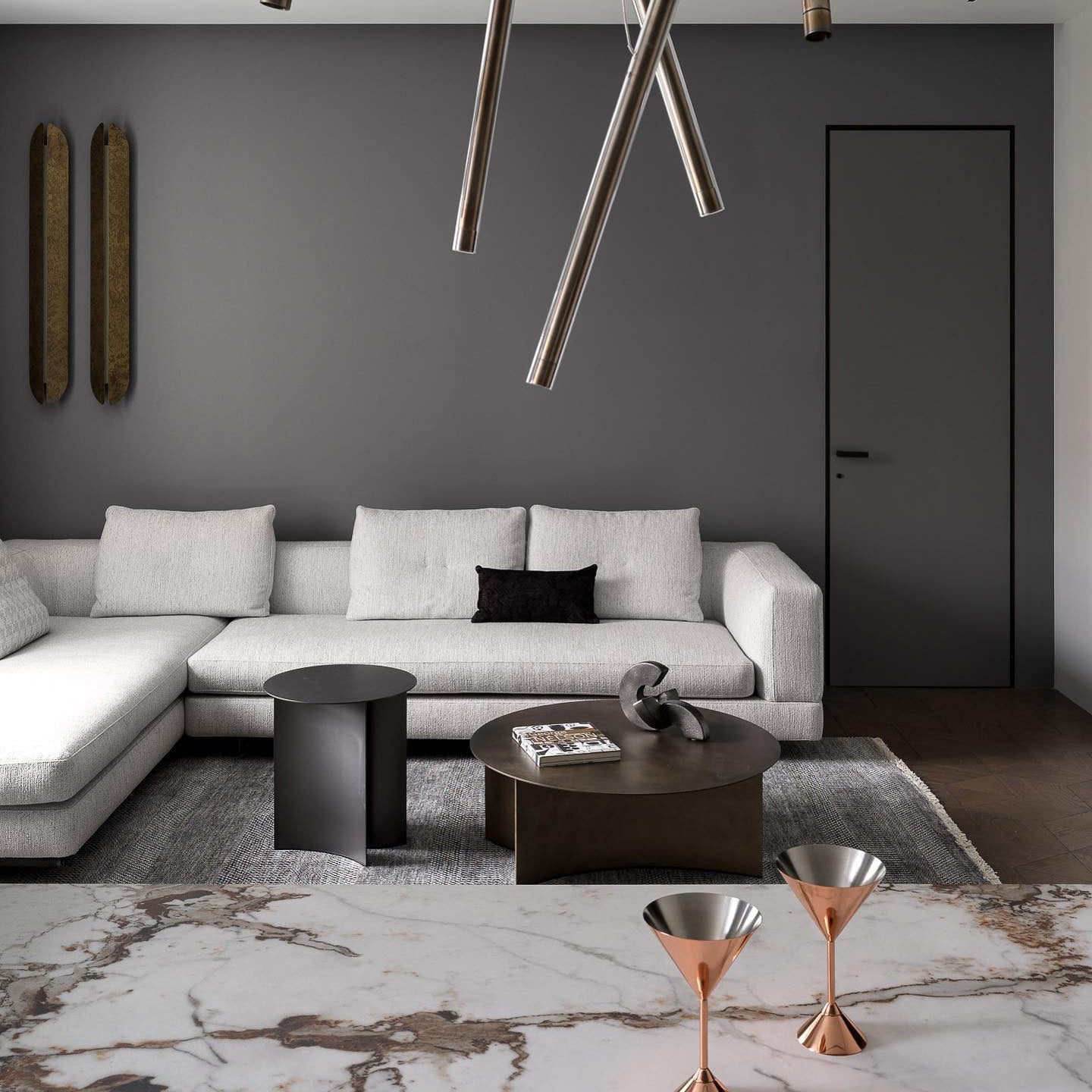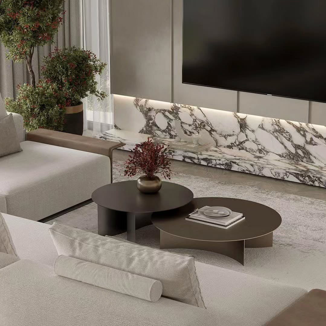 Mesitas redondas con base y tablero con acabado anodic bronze, blanco, negro y oro brillante. La base curva y las alturas diferentes han sido estudiadas para poderlas acercar más fácilmente entre sí para crear composiciones inéditas, divertidas y siempre diferentes.