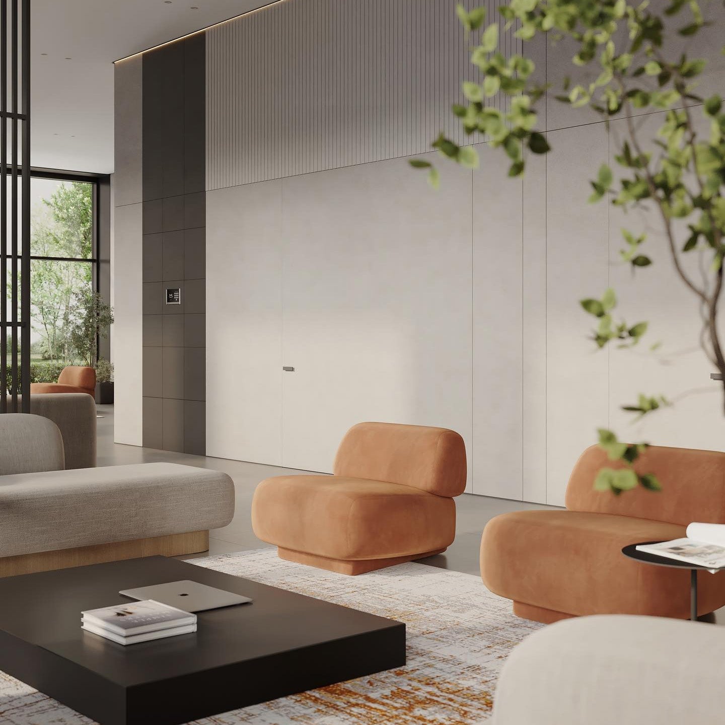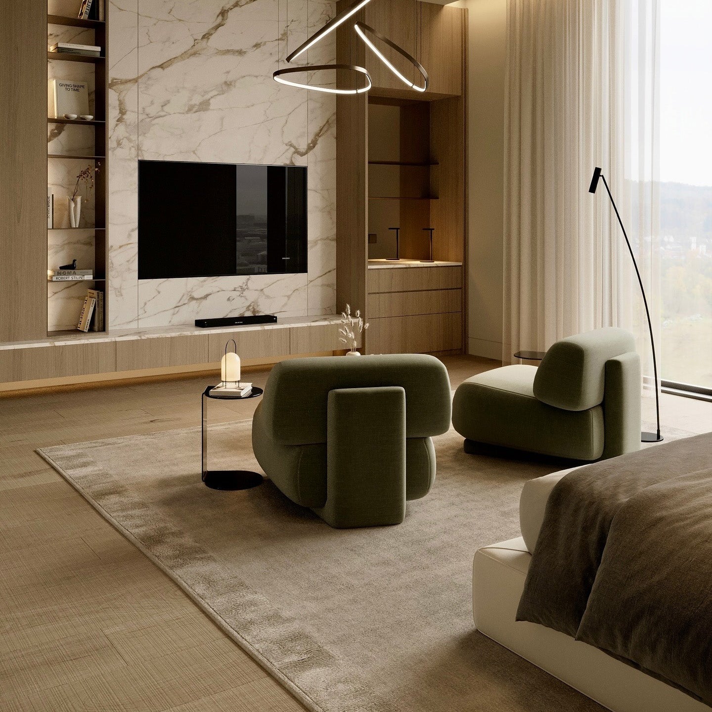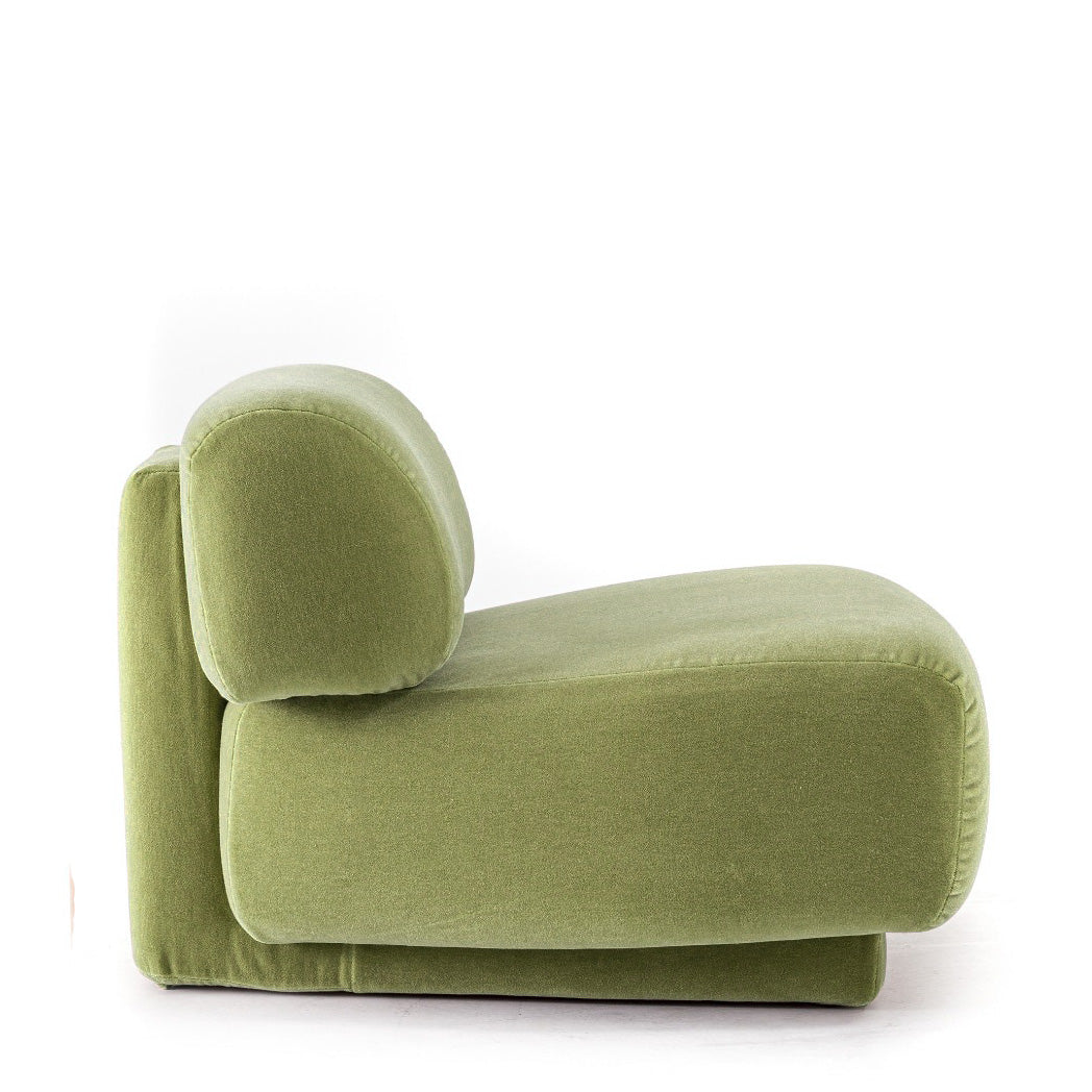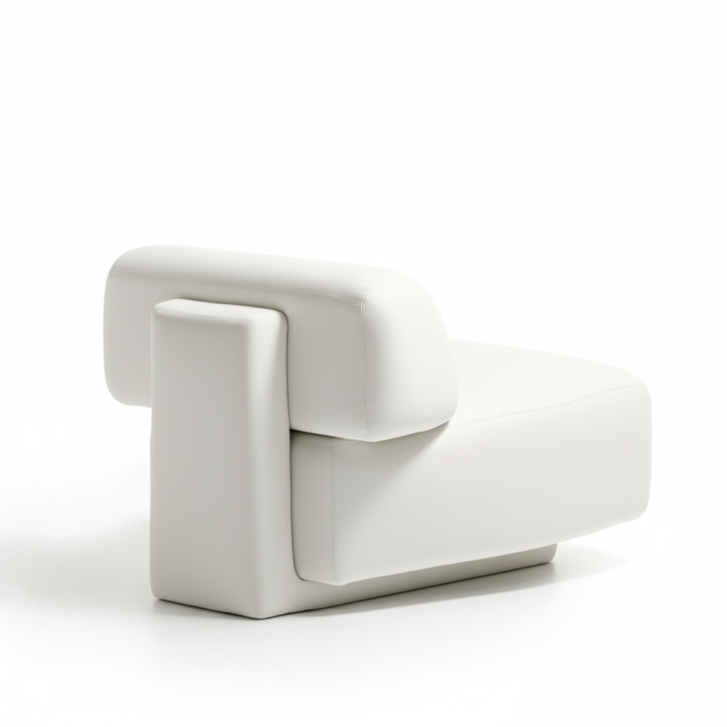 Al igual que en las esculturas de roca, donde las piedras mantienen su equilibrio gracias a su cuidadosa colocación y entrelazado, es la forma la que mantiene el equilibrio entre los elementos del sillón, que no es excesivamente regular. Jugando con la gravedad y el equilibrio, podemos aligerar formas normalmente pesadas.